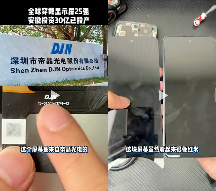 成功拆解后,能看到屏幕来自DJN(帝晶光电),这家公司不在小米和REDMI的供应商列表里,而帝晶光电是专为小尺寸设备定制屏幕的,所以这块屏确实跟小米没关系。