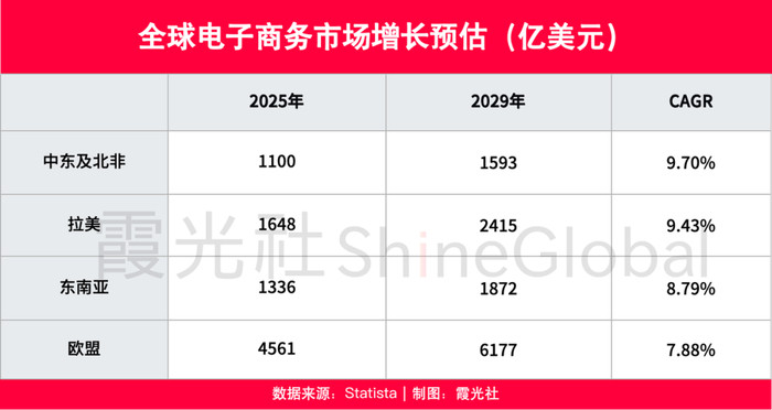 更重要的是,这股增长势头还在继续。Statista的预测显示,拉美电商2025-2029年年均复合增长率将达9.43%,是全球第二大高增长地区;而且其电商规模也是新兴市场中最大的。